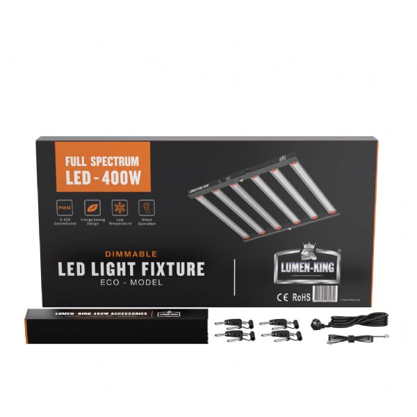 The Lumen King LED Eco-Line 400W is a high-performance lighting system designed to deliver outstanding results in both hobby and large-scale professional cultivation. Using superior quality LED chips, this lamp delivers a luminous efficacy of 2.7 µmol/J, transforming electrical energy into a life boost for plants with minimal heat wastage.