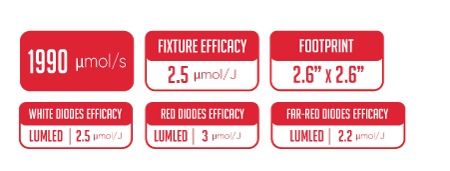 • Outstanding Efficiency: The lamp boasts a high luminous efficacy (Photon Efficacy) of 2.5 micromol/J and a photon flux output (PPF) of 508 micromol/s.